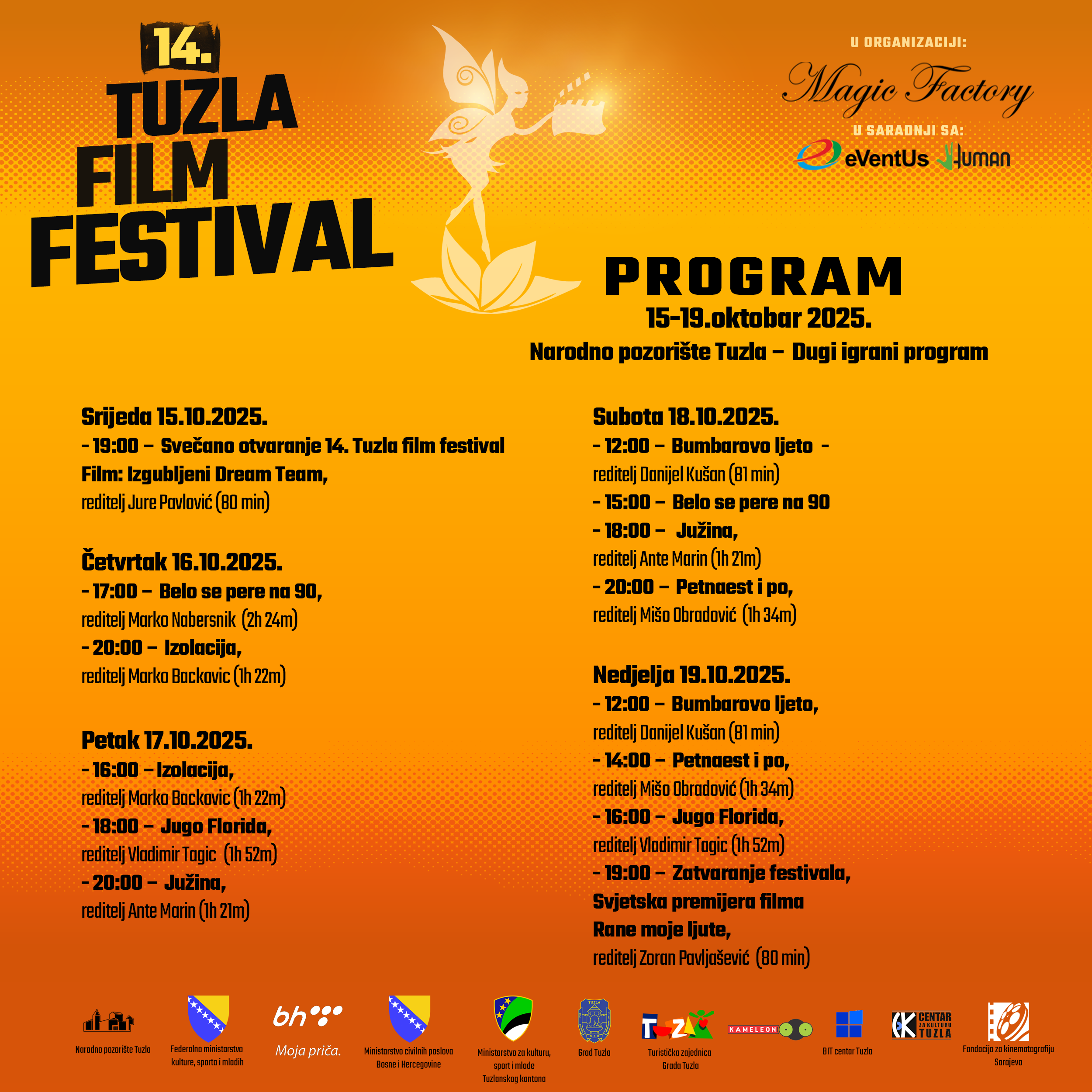 Organizatori festivala su Magic Factory u saradnji sa Eventus i Human. Sve informacije o programu dostupne su na www.tff.ba te društvenim mrežama Facebook @TuzlaFilmFestival i Instagram @TuzlaFilmFest.