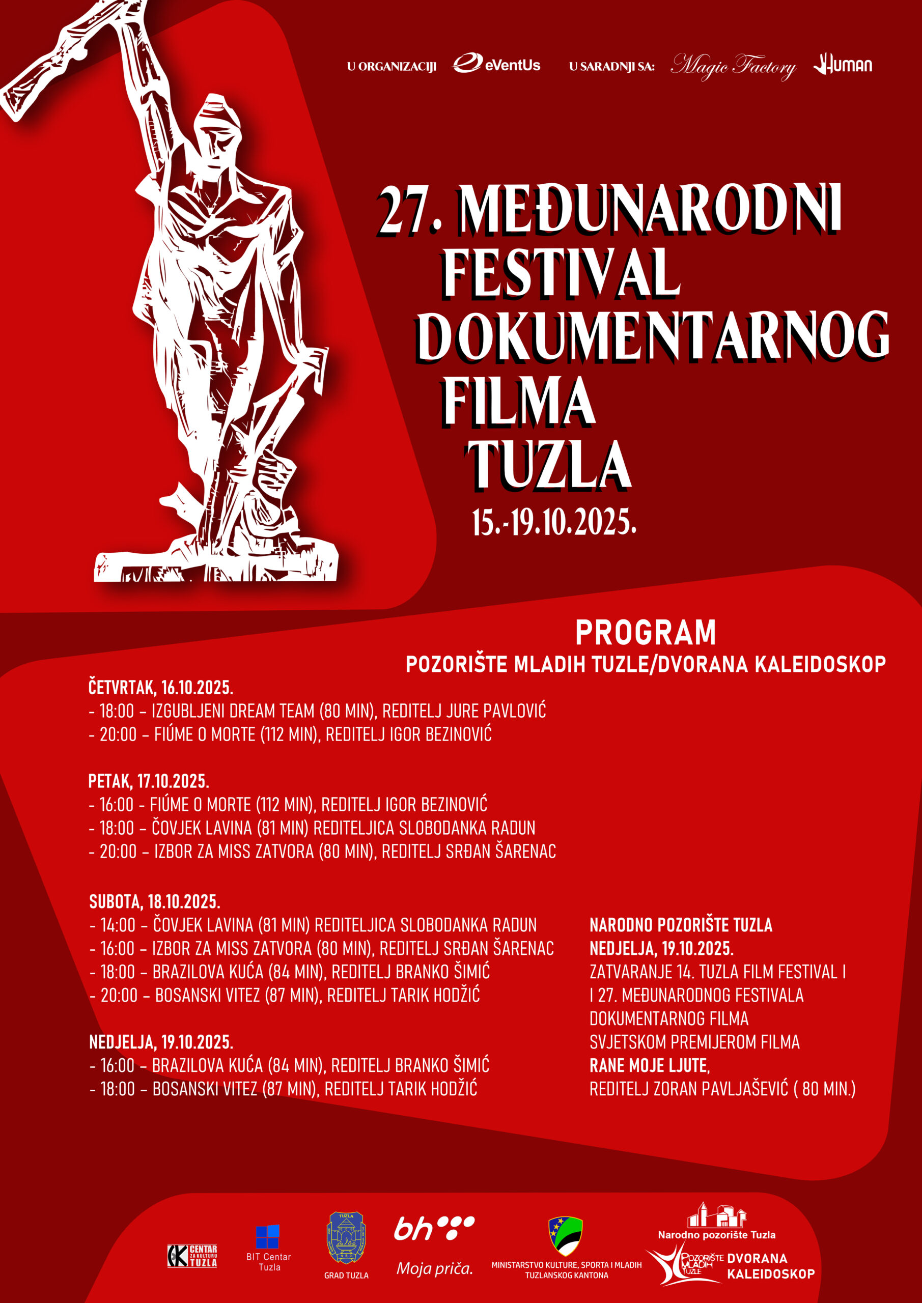 Pored dugometražnog igranog programa publika će i ove godine imati priliku da uživa i u izuzetno kvalitetnom programu dokumentarnih filmova u sklopu 27. Međunarodnog festivala dokumentarnog filma, koji prati Tuzla Film Festival. Dokumentarni filmovi će se prikazivati u Pozorištu mladih Tuzle / Dvorana Kaleidoskop, a festivalsko zatvaranje obilježit će svjetska premijera dokumentarca „Rane moje ljute“ Zorana Pavljaševića.