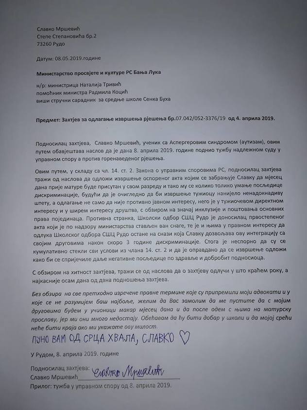 Podnosilac zahtjeva Slavko Mršević, učenik s Aspergerovim sindromom (autizam), ovim putem obavještava naslov da je 8. aprila 2019. godine podnio tužbu nadležnom sudu u upravnom sporu, a protiv navedenog rješenja.