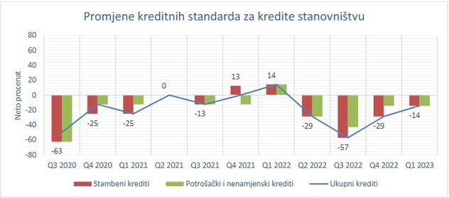 Neto procenat promjene u prethodna tri kvartala ukazuje na blago pooštravanje kreditnih standarda (tj. interne smjernice ili kriteriji odobravanja kredita) za stambene kao i za potrošačke i nenamjenske kredite, a koje je naročito izraženo u Q3 2022. godine za stambene kredite.