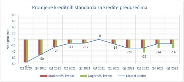 U trećem kvartalu 2022. godine i prvom kvartalu 2023. godine, banke su prijavile da su povećale udio odbijenih kreditnih zahtjeva, za razliku od četvrtog kvartala 2022. godine, kada je prijavljeno smanjenje udjela odbijenih zahtjeva za kredite koji se odobravaju preduzećima.