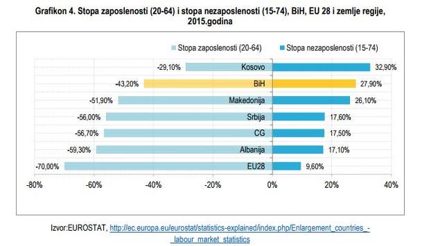 Posmatrajući BiH i zemlje iz okruženja i EU28, vidljivo je da BiH ima veću stopu zaposlenosti i manju stopu nezaposlenosti samo od Kosova. Prema godišnjem izvještaju o implementaciji Strategije Jugoistočne Evrope, stopa zaposlenosti regije jugoistočne Evrope iznosi 51,4 posto, tako da BiH zaostaje za 8,2 procentna poena.