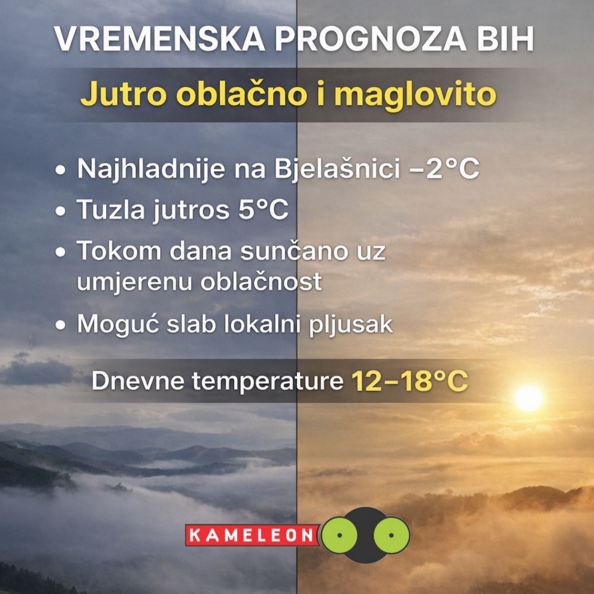 U Bosni i Hercegovini danas se očekuje umjereno do pretežno oblačno vrijeme, uz prolaznu nestabilnost.