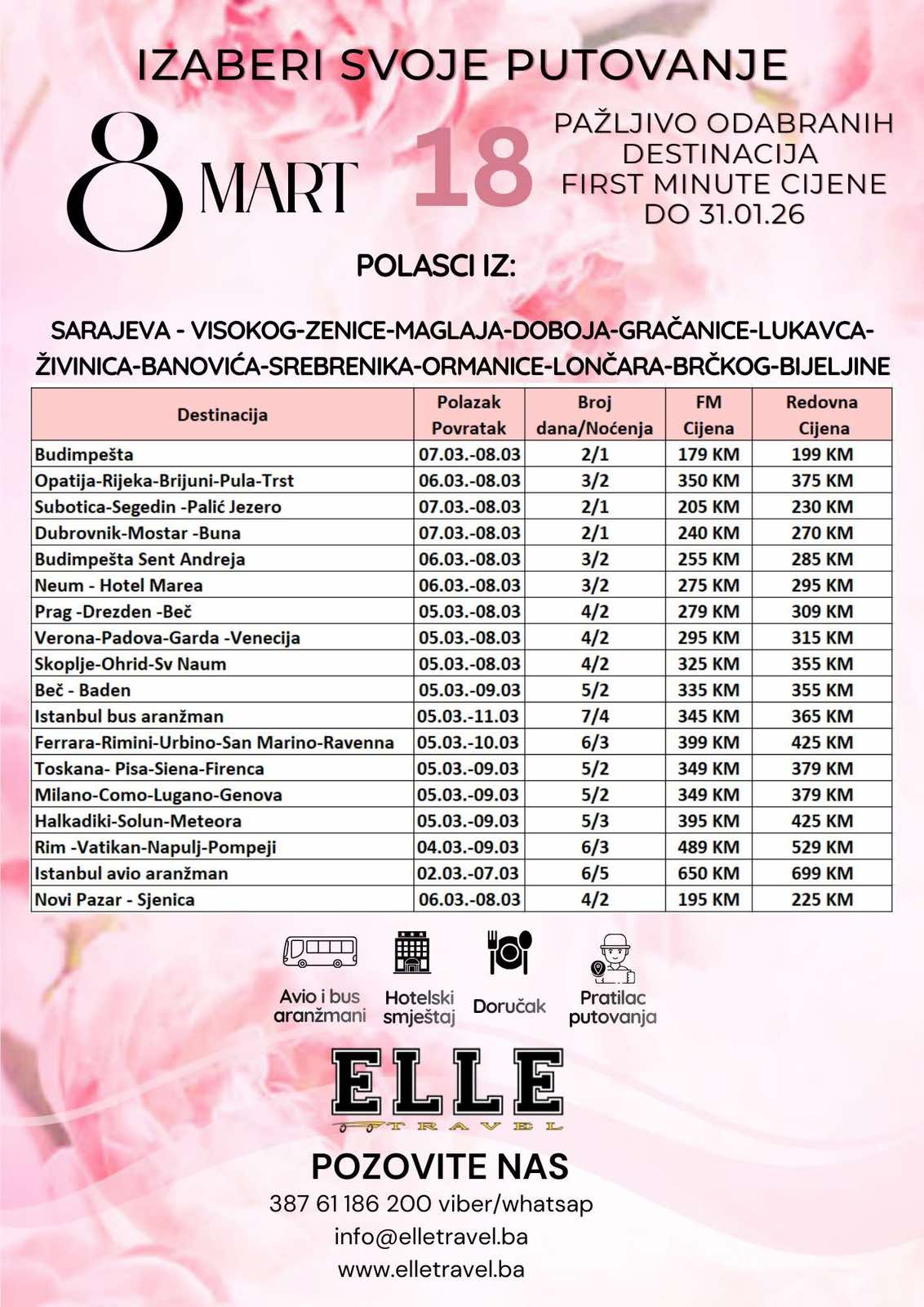 Ponuda uključuje i autobuske i avio aranžmane, a ograničen broj mjesta dodatno naglašava važnost ranih rezervacija. Kompletnu ponudu aranžmana za 8. mart zainteresovani mogu pogledati OVDJE, dok Elle Travel poziva sve koji planiraju putovanje da na vrijeme osiguraju svoje mjesto i obilježe Dan žena na poseban način.