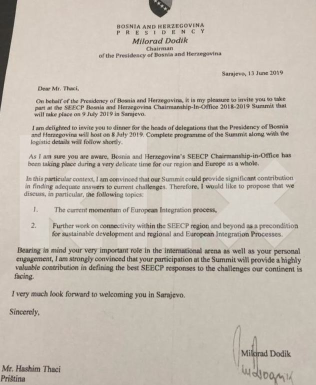 Klix.ba ekskluzivno objavljuje fotografiju pisma predsjedavajućeg Predsjedništva BiH Milorada Dodika predsjedniku Kosova Hashimu Thaciju na samit Procesa saradnje u Jugoistočnoj Evropi (SEECP), a koji se ove godine održava u Bosni i Hercegovini.