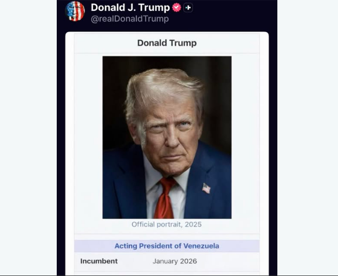 Američki predsjednik Donald Trump objavio je na svojoj društvenoj mreži Truth Social snimak ekrana na kojem se, pored titula 45. i 47. predsjednika Sjedinjenih Američkih Država, navodi i kao vršilac dužnosti predsjednika Venecuele, uz datum stupanja na dužnost u januaru 2026. godine.