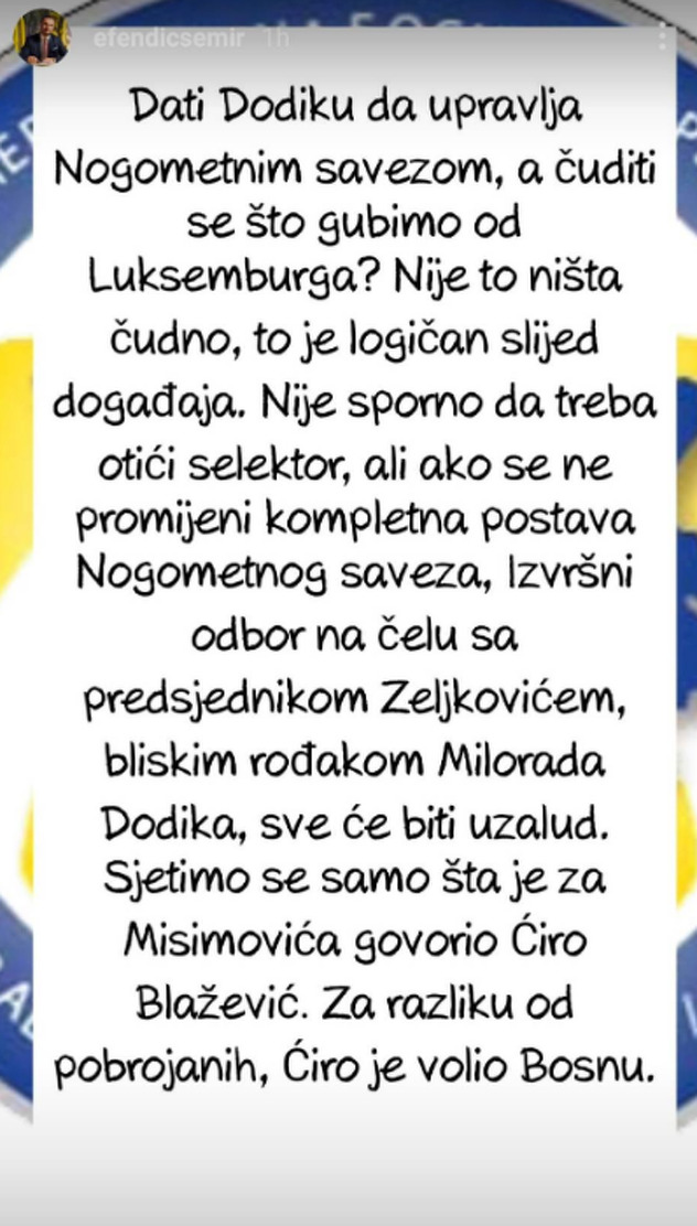 “Dati Dodiku da upravlja Nogometnim savezom, a čuditi se što gubimo od Luksemburga? Nije to ništa čudno, to je logičan slijed događaja. Nije sporno da treba otići selektor, ali ako se ne promijeni kompletna postava saveza, Izvršni odbor na čelu sa predsjednikom Zeljkovićem, bliskim rođakom Milorada Dodika, sve će biti uzalud. Sjetimo se samo šta je za Misimovića govorio Ćiro Blažević. Za razliku od pobrojanih, Ćiro je volio Bosnu”, napisao je Efendić na svom profilu.