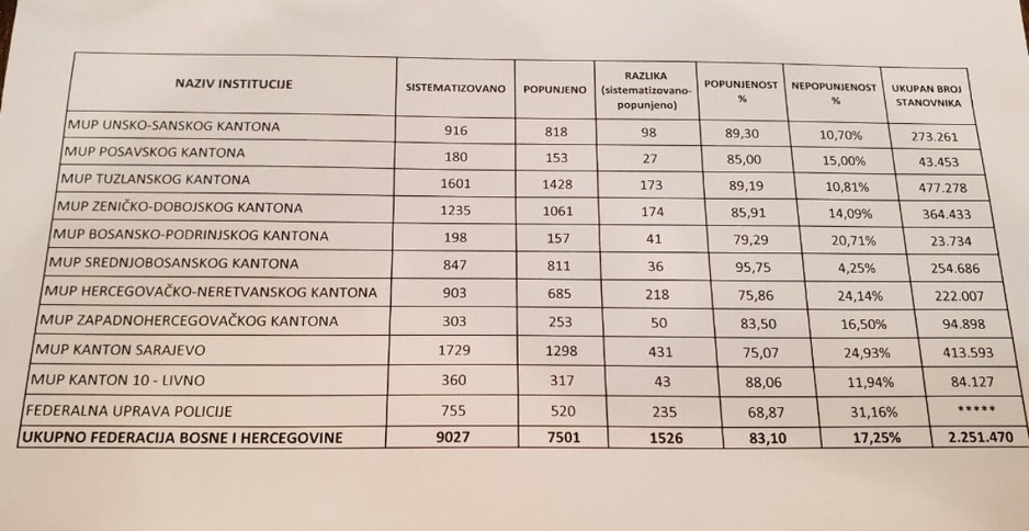 Situacija na terenu pokazuje da najviše policajaca nedostaje Kantonu Sarajevo i to 431, FUP-u nedostaje 235 policajaca, MUP-u HNK 218, TK 173, ZDK 174, MUP-u USK 98, policiji Posavskog kantona 27, BPK-u 41 policajac, SBK-u 36, ZHK-u 50 te MUP-u Kantona 10 43, odnosno ukupno 1.526 policajaca.