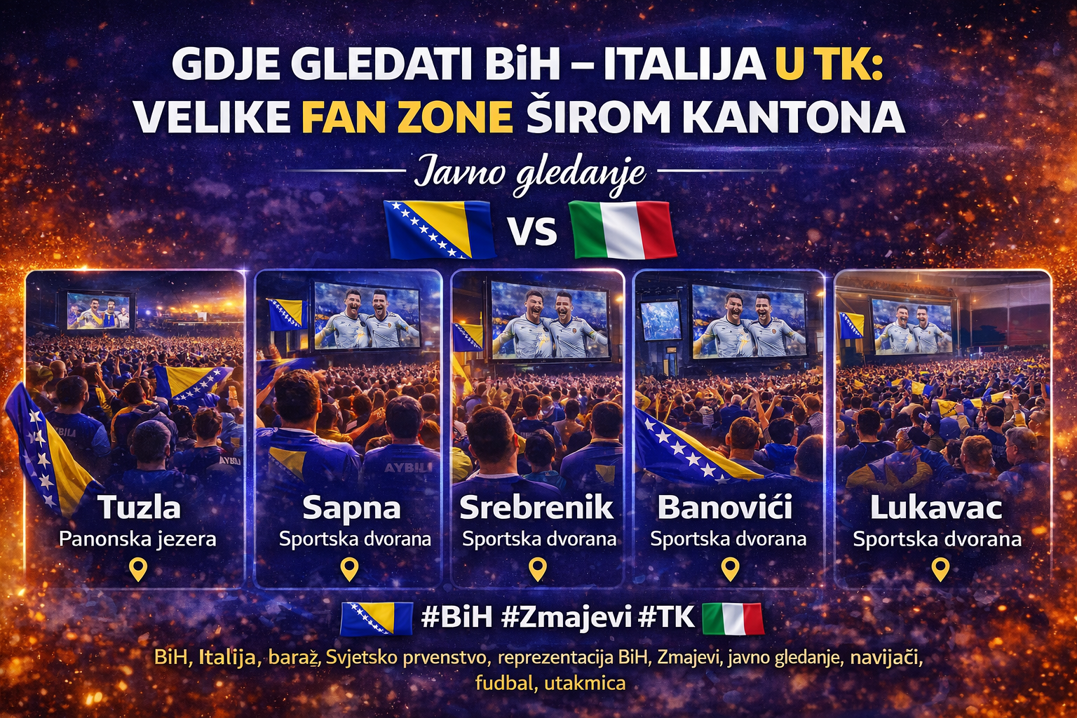 Finale baraža za Svjetsko prvenstvo između Bosne i Hercegovine i Italije večeras će ujediniti navijače širom Tuzlanskog kantona, a organizovano je i više lokacija za zajedničko praćenje utakmice.