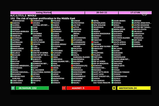 Pet nacija koje su se usprotivile rezoluciji usvojenoj u petak pod nazivom “rizici od nuklearnog širenja na Bliskom istoku” su: Kanada, Izrael, Mikronezija, Palau i Sjedinjene Američke Države. Još 24 zemlje bile su uzdržane, uključujući članice Evropske unije.