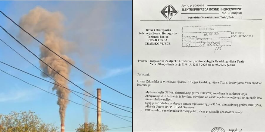 Građani su proteklih dana prijavljivali gust tamni dim iz dimnjaka termoelektrane, što je izazvalo sumnje u nezakonito sagorijevanje otpada. Te sumnje dodatno su potkrijepljene dopisom JP “Elektroprivreda BiH” – Podružnica Termoelektrana Tuzla, u kojem se navodi da se na deponiji nalazi mješavina od 98% uglja i 2% RDF-a.