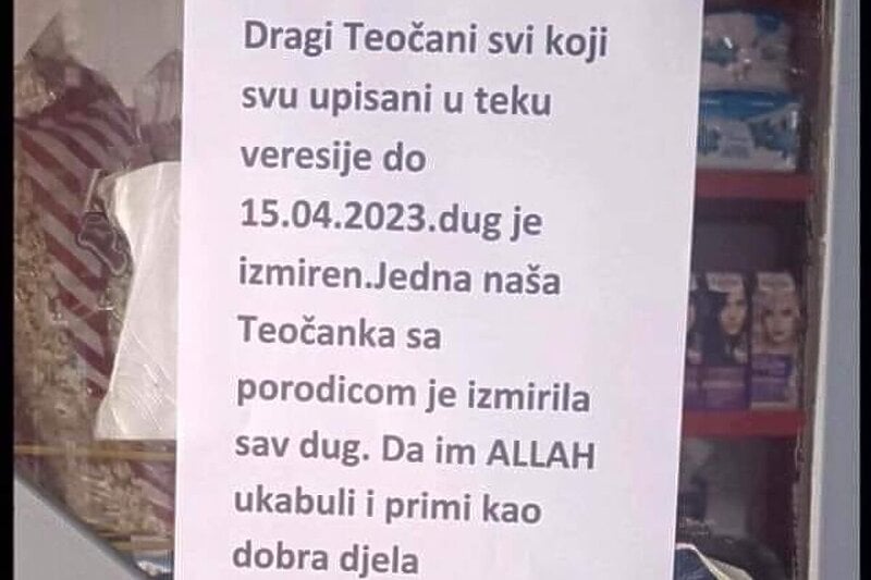 “Dragi Teočani, svi koji su upisani i teku veresije do 15.04.2023., dug je izmiren. Jedna naša Teočanka sa porodicom je izmirila sav dug. Da im Allah ukabuli i primi kao dobra djela”, piše u obavještenju.