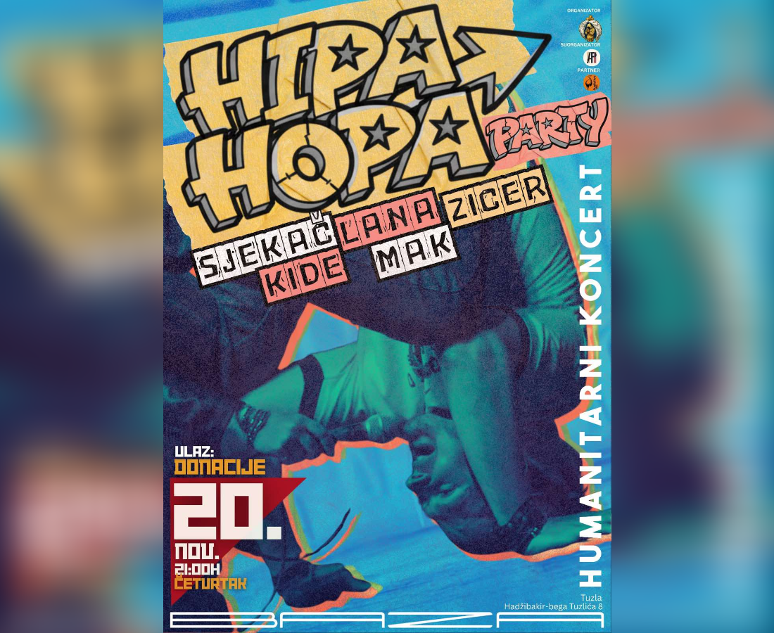 U četvrtak, 20.11., s početkom u 21:00h, u kafiću Baza biće održan humanitarni party na kojem će nastupiti mladi umjetnici iz Tuzle i okolnih gradova.