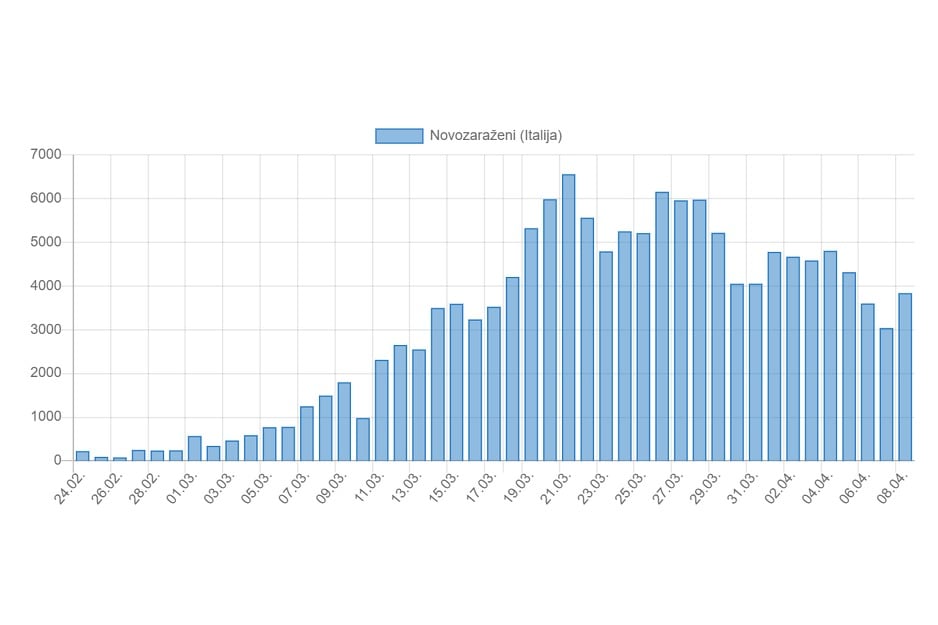 U Italiji je prema najnovijim podacima u posljednja 24 sata zabilježen 3.836 novih slučajeva zaraze koronavirusom, što predstavlja rast (+21 posto) broja novozaraženih u odnosu na dan ranije kada je zabilježen 3.039 novi slučaj.