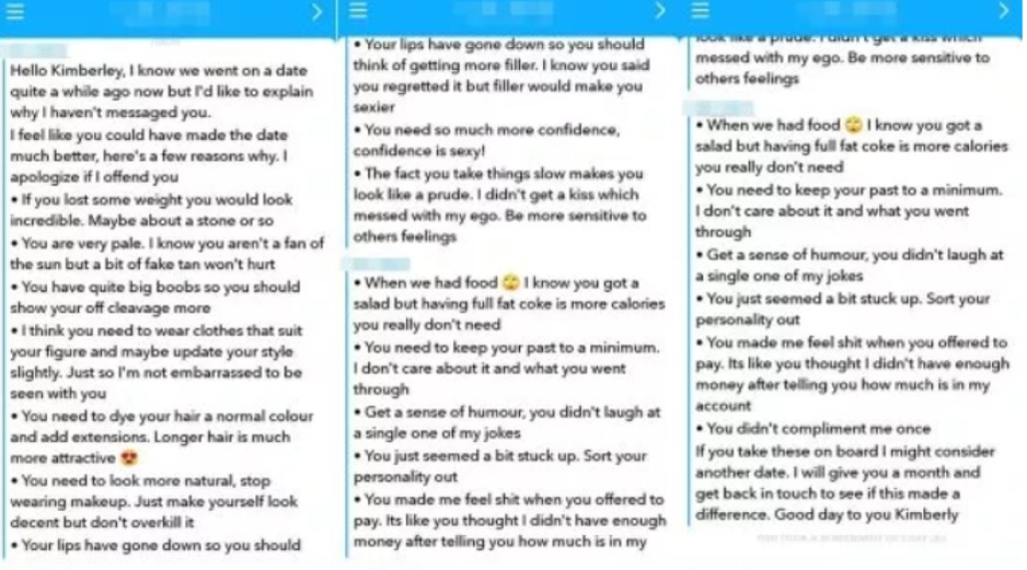“Obzirom da imaš velike grudi, ne bi ti škodilo da nosiš malo dublji dekolte. Trebala bi malo promijeniti stil i nositi odjeću koja više pristaje tvojoj liniji, ili bi trebala promijeniti stil. Kosu bi trebala promijeniti u normalnu boju, a preporučujem ti da staviš ekstenzije jer je duža kosa uvijek privlačnija”, pisao je.