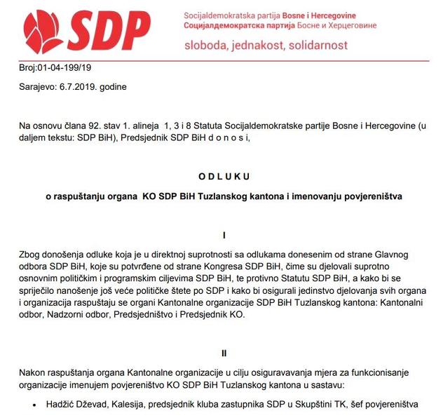 “Članovi rukovodstva organizacije su svjesni kako je Statutom SDP BiH propisano da Glavni odbor SDP BiH jedini ima nadležnost da donosi odluku o uspostavljanju koalicija sa drugim strankama, zbog čega su zaključci KO SDP TK izvan njihove nadležnosti, pa samim tim i ne mogu proizvesti bilo kakvo dejstvo prema vani, ali ni unutra, prema članicama i članovima organizacija iz TK koji ih ne budu poštovali. Statutom SDP BiH, pored ostalog, propisano je da Predsjednik u hitnim slučajevima može donijeti odluke iz domena predstavljanja i zastupanja SDP BiH koje se temelje na odlukama i stavovima organa SDP BiH. Imajući u vidu da sam trenutno jedini organ na nivou SDP BiH u punoj funkciji, s jasno utvrđenim pravima i obavezama, svjestan činjenice da ovakvim djelovanjem rukovodstvo KO, koje se ponaša kao autonomni potpuno otuđeni dio organizacije i na taj način nanosi sve veću političku štetu po SDP BiH, svjesno krši odluke viših organa, narušava jedinstvo djelovanja u organizacijama i između pojedinih organizacija, iskoristio sam svoje ovlasti i donio odluku o raspuštanju organa KO SDP TK”, navodi se u saopćenju za javnost Nermina Nikšića.