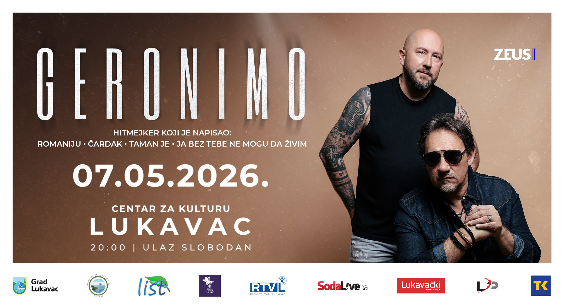Geronimo će kroz ovaj koncert napraviti svojevrsno muzičko putovanje kroz svoju bogatu diskografiju i hitove poput Romanije, Čardaka i mnogih drugih. Trenutno radi kao autor pjesama sa najvećim zvijezdama regije.