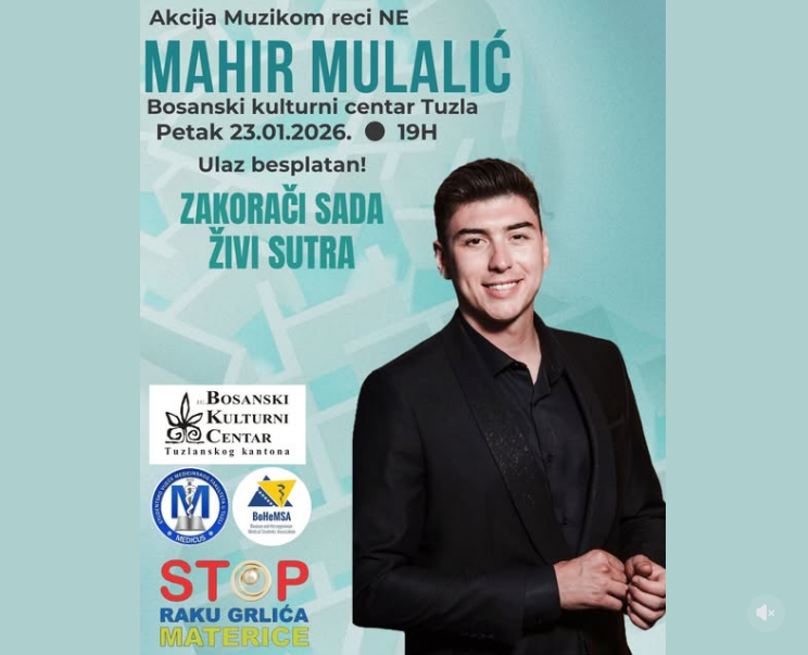 U okviru preventivne akcije „Muzikom reci NE“, u petak, 23. januara 2026. godine, s početkom u 19 sati, u Bosanskom kulturnom centru Tuzla bit će održan koncert popularnog bosanskohercegovačkog pjevača Mahira Mulalića.