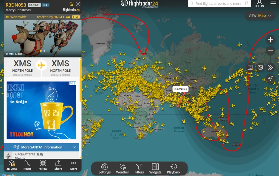 Putovanje Djeda Mraza započelo je na Sjevernom polu, a planirano je da se završi na istom mjestu, nakon obilaska gotovo svih kontinenata. Prema podacima aplikacije Flightradar24, saonice Djeda Mraza lete na visini od oko 18 kilometara.