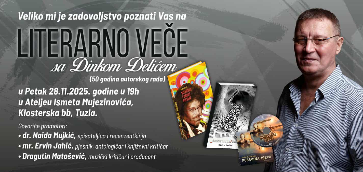 U petak, 28. novembra 2025. godine u 19:00 časova, u ateljeu “Ismet Mujezinović” u Tuzli (Klosterska 19), održat će se literarno veče posvećeno Dinku Deliću, povodom obilježavanja 50 godina njegovog autorskog rada.