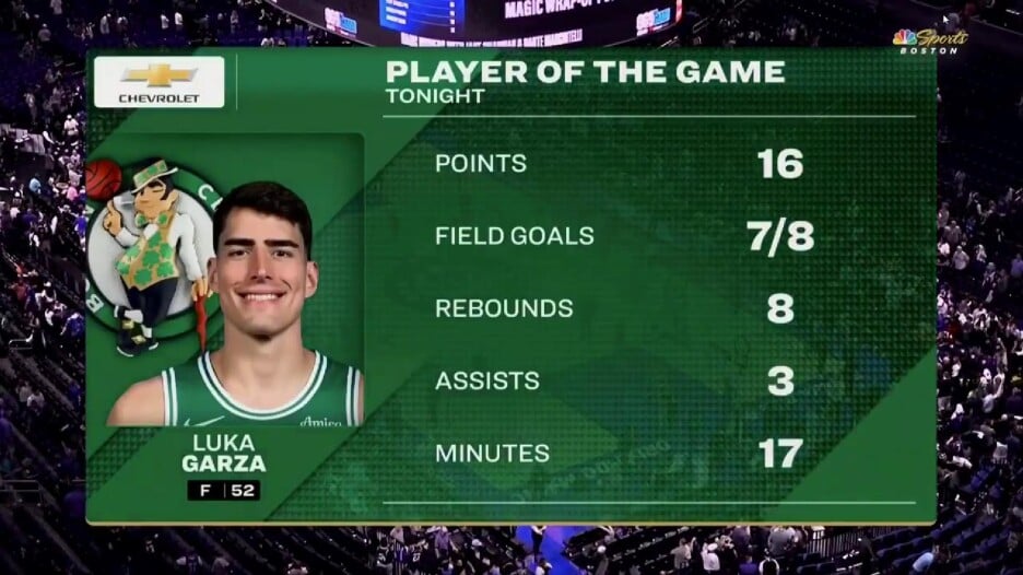 Boston je slavio u Orlandu rezultatom 111:107, a Garza je za 17 minuta na parketu upisao 16 poena uz impresivan šut iz igre 7/8. Za dva poena je bio stopostotan (7/7), jedinu trojku promašio je, dok je s linije slobodnih bacanja imao polovičan učinak (2/4).