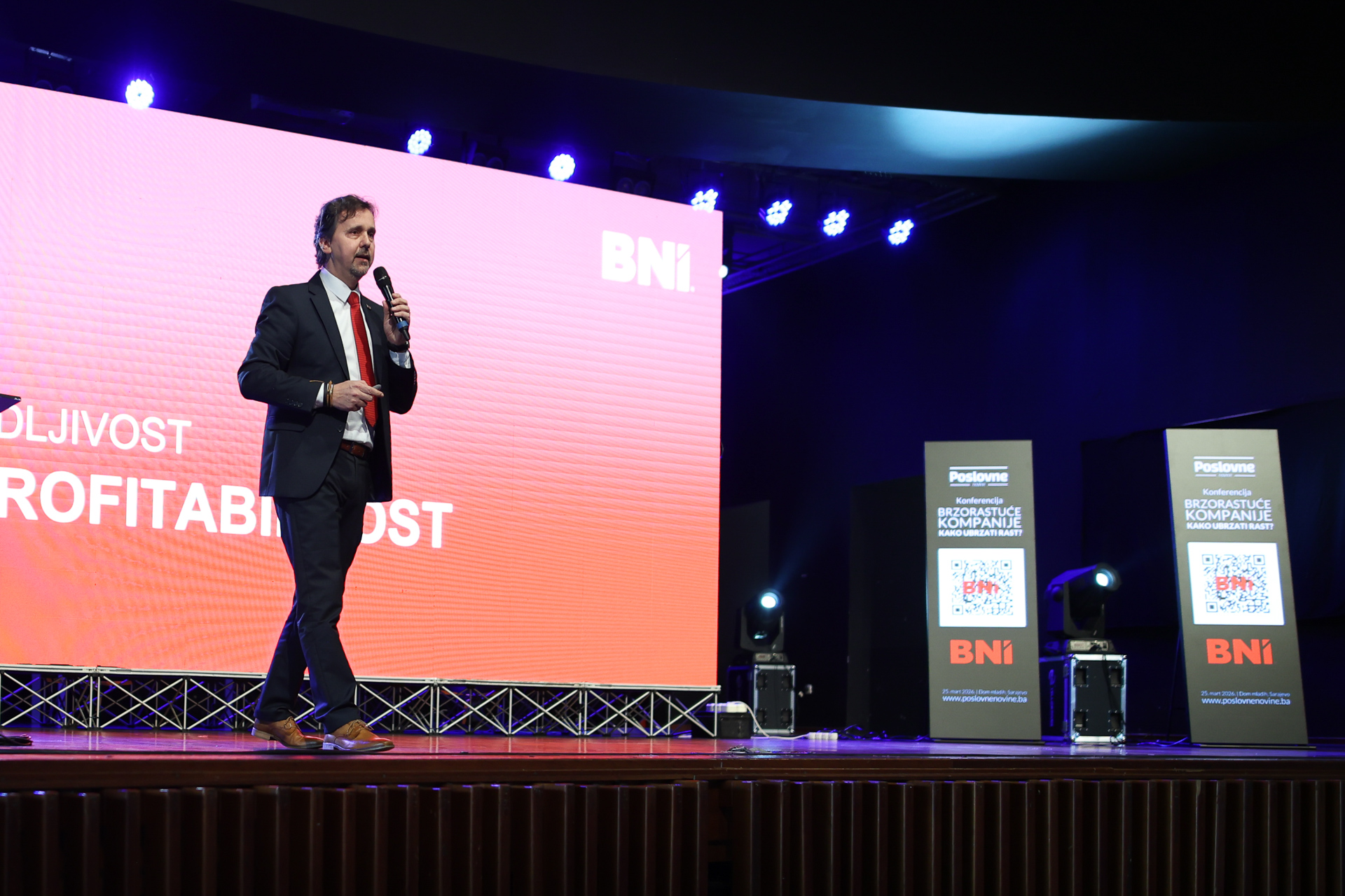 Predavači konferencije bili su Jernej Pirc, iz Slovenie, vlasnik i direktor BNI – Business Network International Adria s temom „Networkingom ka ubrzanom rastu – od kontakta do preporuke“, Andrija Čolak, iz Hrvatske, osnivač i vlasnik Colak Franchise Consulting Group s temom „Kupovina i prodaja firmi: Između emocije i tržišne realnosti“, Alma Aljićević, Key Account Manager Dun & Bradstreet iz Sarajeva, s temom „AI u službi poslovnih odluka – Chat D&B“, Edin Halilović, Co-Founder of Lilium d.o.o. Sarajevo s temom „Kako ubrzati rast povezivanjem marketinga i prodaje“.