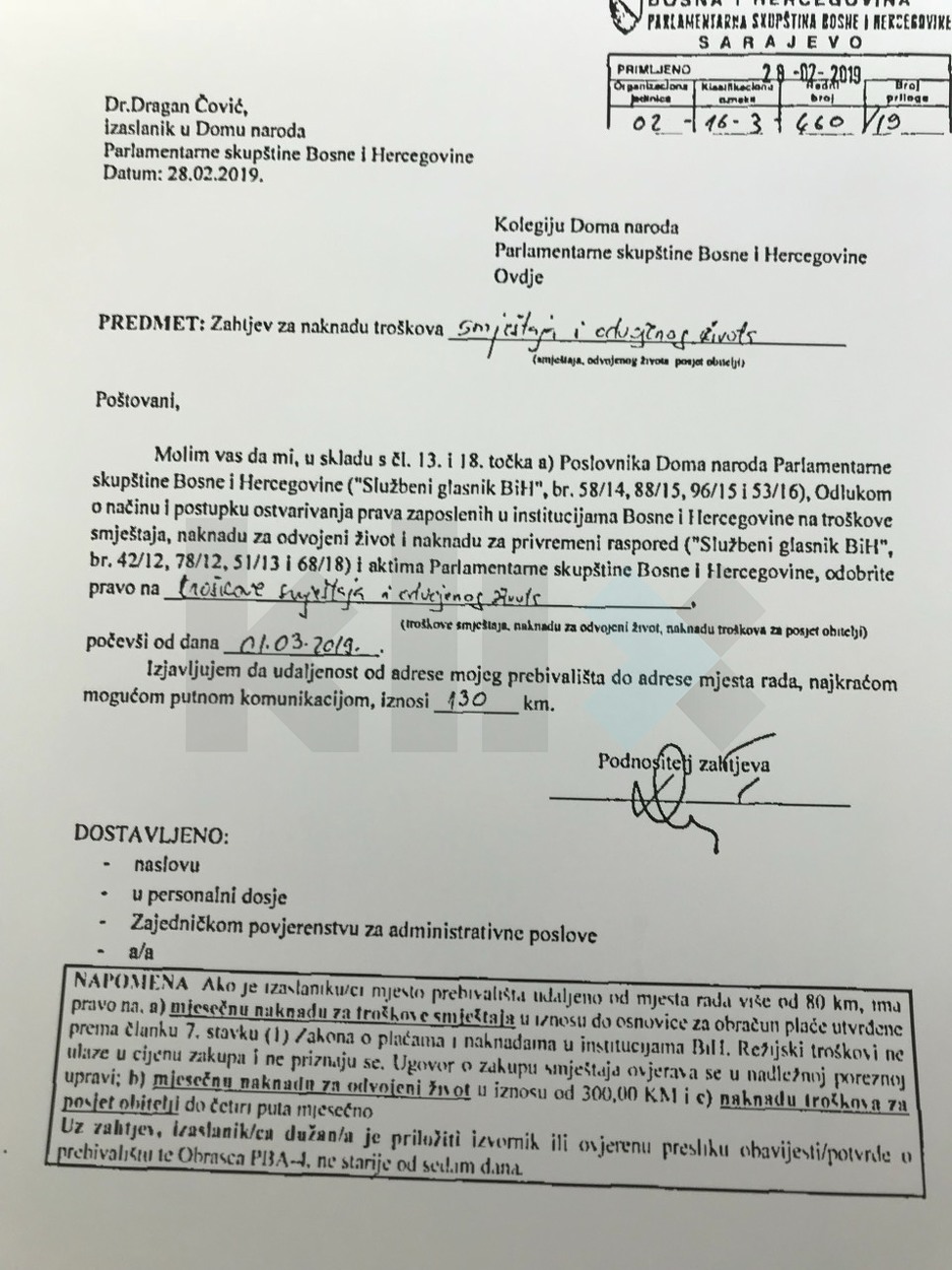 Kada je riječ o troškovima za odvojeni život, Čoviću bi trebalo pripasti oko 270 KM, s obzirom na udaljenost prebivališta od mjesta rada. On je u svom zahtjevu naveo da ta udaljenost iznosi 130 kilometara, a riječe je o relaciji Mostar – Sarajevo.