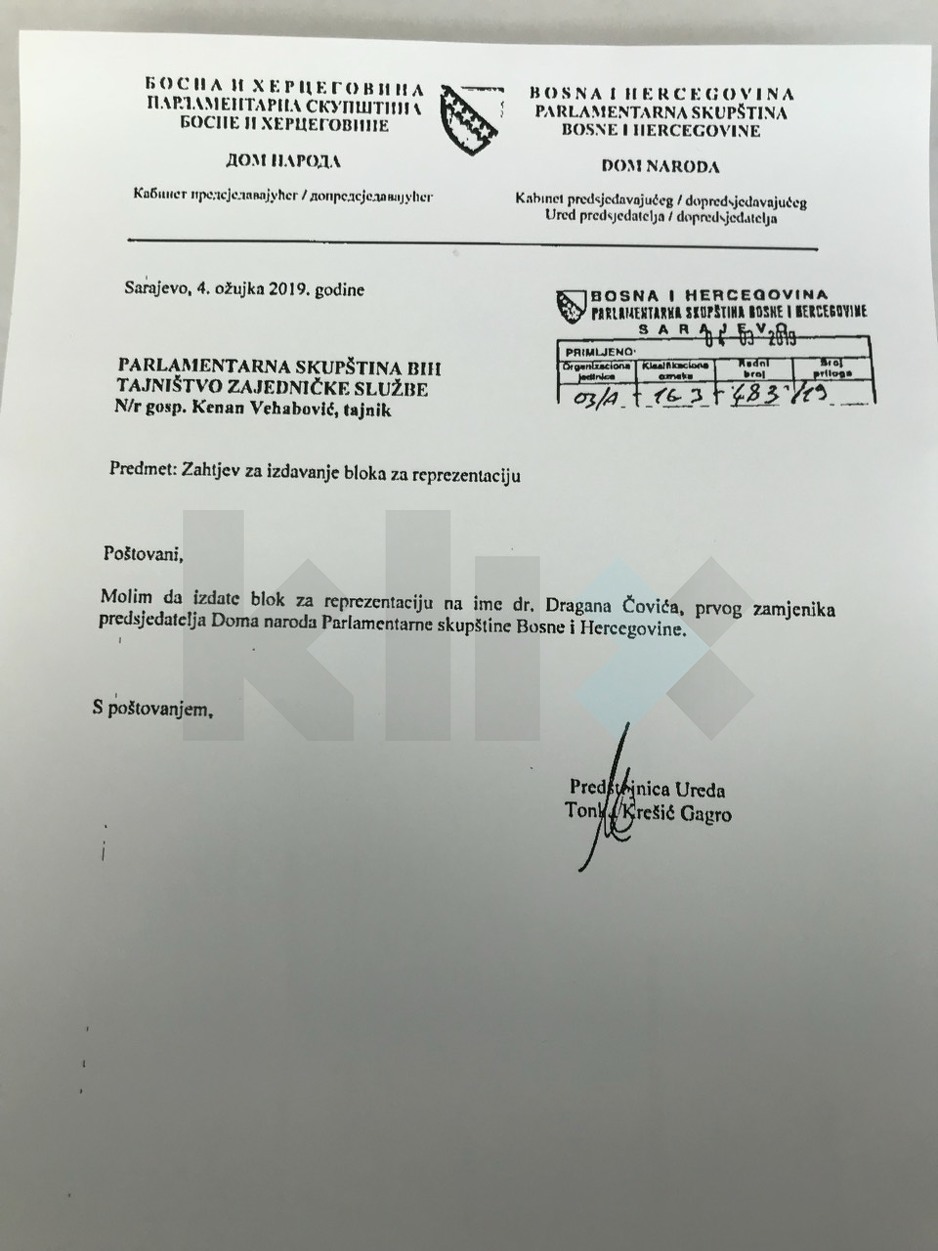 Također, Čović je podnio i zahtjev za izdavanje bloka za reprezentaciju, a što ga slijeduje kao prvog zamjenika predsjedavajućeg Doma naroda.