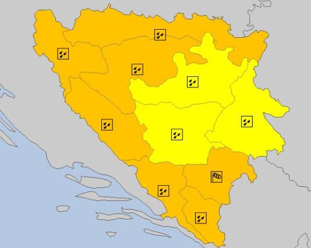 Narandžasti meteoalarm uključen je za područja Banje Luke, Livna, Bihaća, Mostara, Trebinja, Foče i Prijedora, dok je za ostala područja na snazi žuto upozorenje.