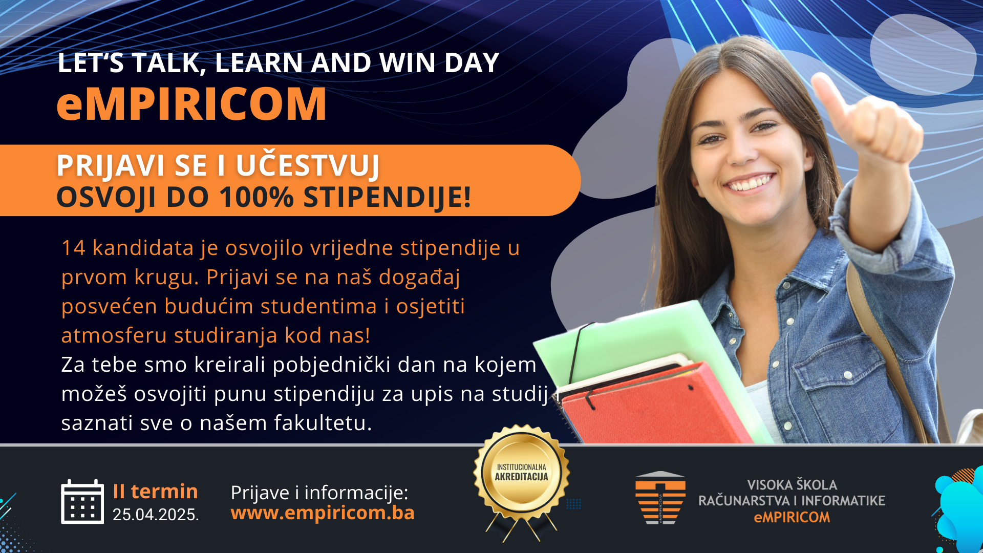 Nakon sjajnog odaziva na prvom Let‘s Talk, Learn and Win Day eMPIRICOM u martu, gdje je čak 14 maturanata osvojilo vrijedne stipendije za studij, Visoka škola eMPIRICOM ponovno otvara vrata svim zainteresiranim budućim studentima!