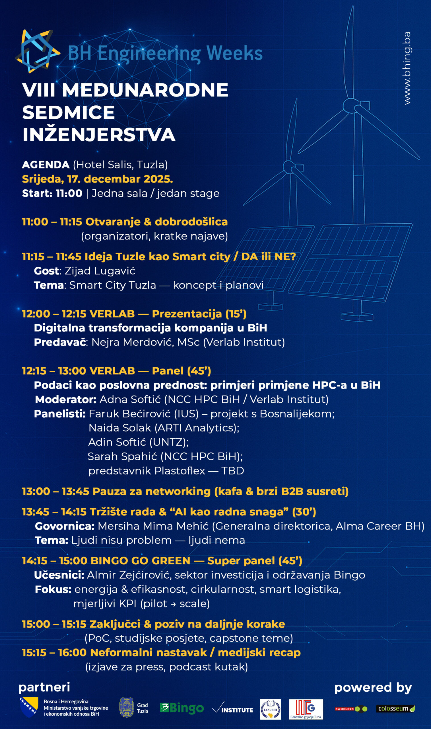 Tuzla će 17. decembra 2025. godine biti domaćin SMART INDUSTRY DAY-a, centralnog događaja u okviru BH Sedmice inženjerstva, koji će se održati u Hotelu Salis od 11:00 do 16:00 sati.