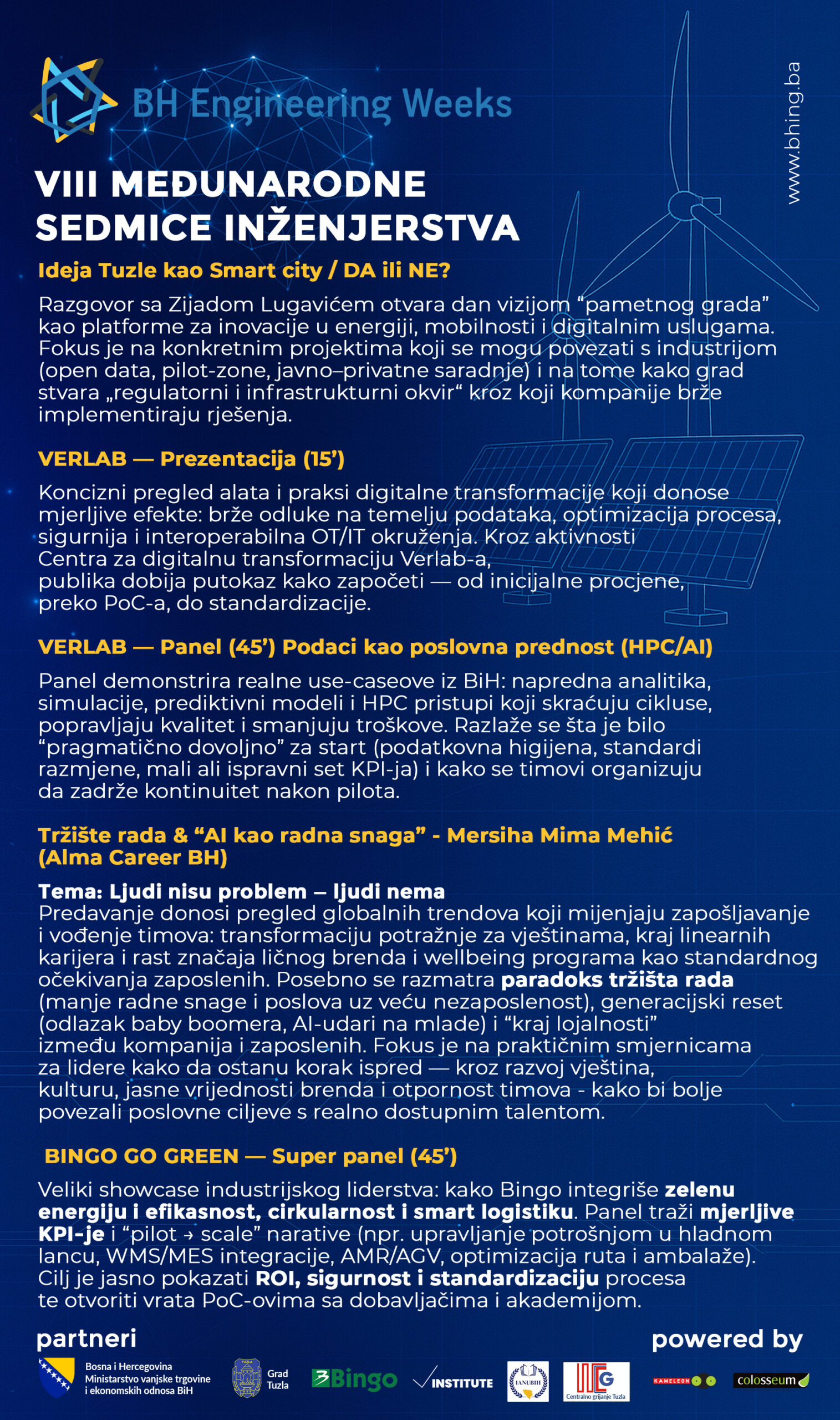 BH Sedmica inženjerstva predstavlja platformu koja povezuje škole, univerzitete, kompanije i gradove, s jasnom misijom promocije inženjerskih profesija, novih tehnologija i održivog razvoja. Kroz niz aktivnosti, uključujući predavanja, panele i susrete s učenicima i studentima, ova inicijativa nastoji približiti inženjerstvo mladima, pokazati kako zelena energija, automatizacija i umjetna inteligencija već mijenjaju domaću industriju te otvoriti razgovor o Tuzli kao gradu znanja, tehnologije i pametnih rješenja.