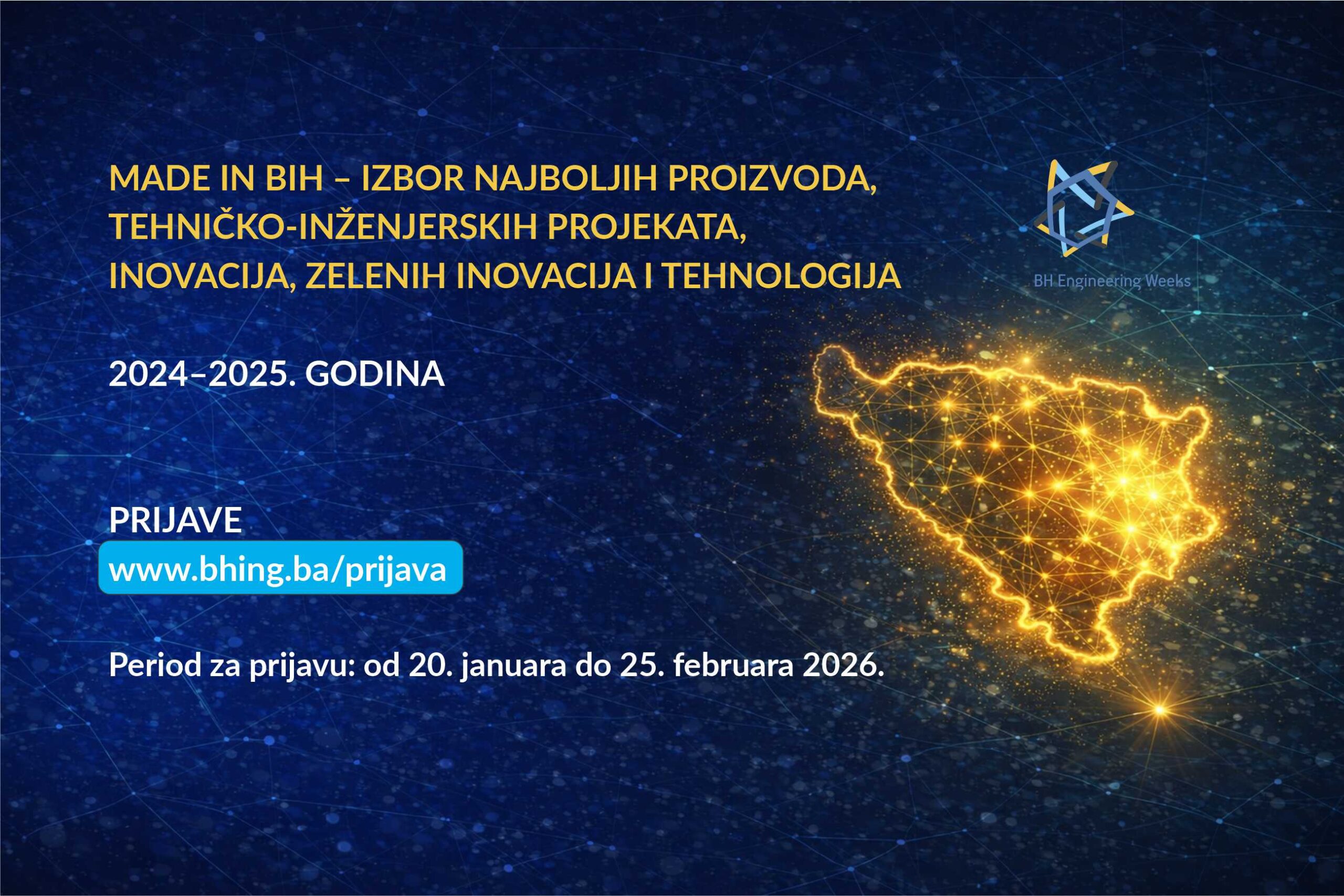 U okviru VIII Međunarodnih BH Sedmica inženjerstva, otvaramo poziv za prijavu na izbor za priznanje „Made in BiH“, namijenjen kompanijama, inženjerskim timovima, institucijama i pojedincima koji su u protekle dvije godine realizovali značajne tehničko-inženjerske projekte, razvili proizvode, tehnologije ili inovativna rješenja sa jasnim tržišnim, društvenim ili razvojnim efektom.