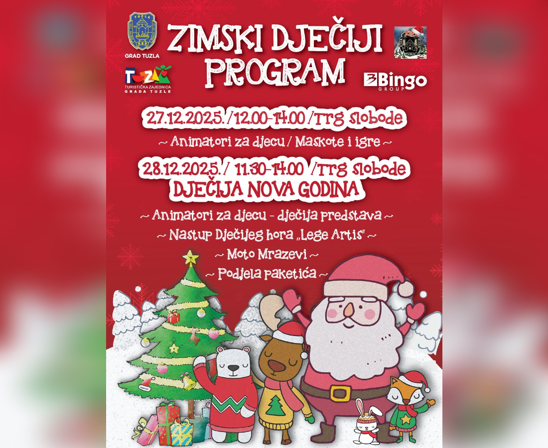 U okviru novogodišnjih praznika, Grad Tuzla i Turistička zajednica grada Tuzle pripremili su bogat i raznovrstan program namijenjen najmlađim sugrađanima, koji će biti održan na Trgu slobode tokom vikenda, 27. i 28. decembra 2025. godine.