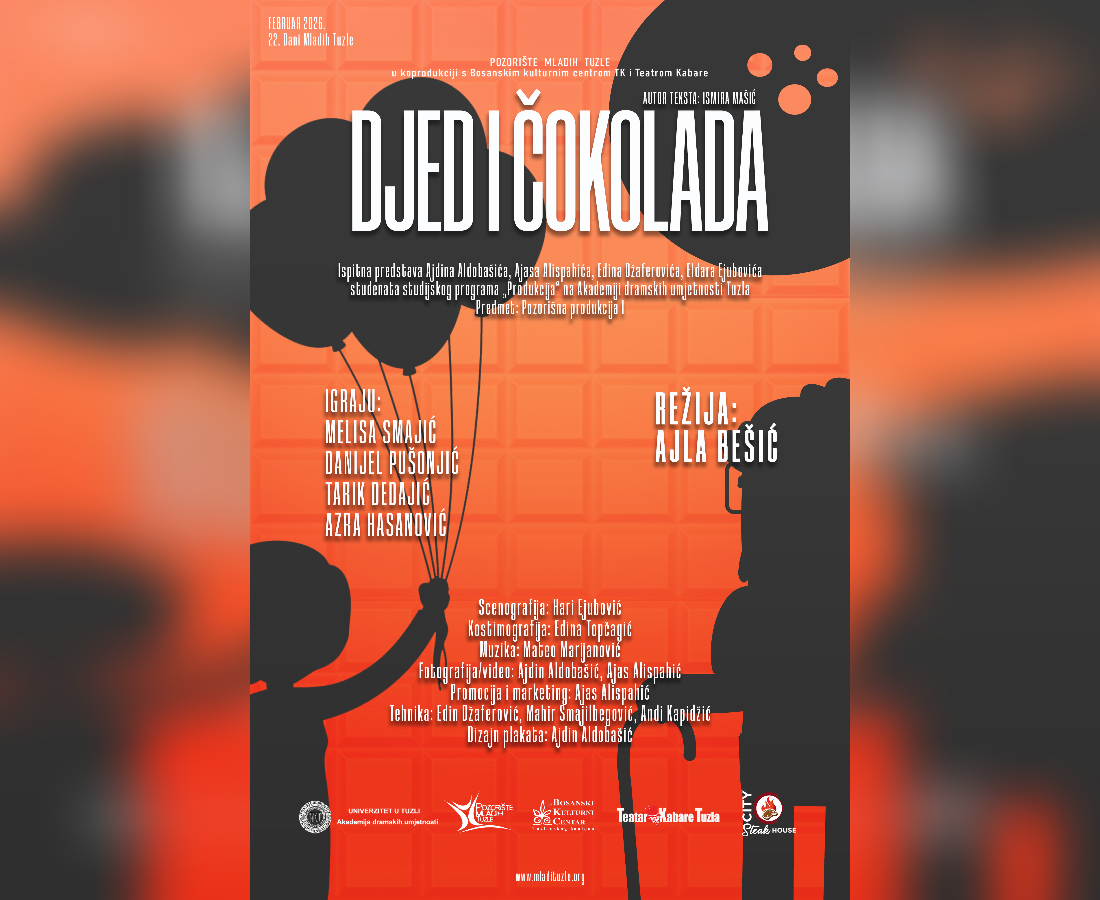 U okviru „22. Dana Mladih Tuzle“ kojim se ove godine obilježava 22 godišnjica postojanja i kontinuiranog rada Udruženja „Mladi Tuzle“ i Pozorišta mladih Tuzle, u četvrtak, 26.2.2026. godine u 19.30 sati na sceni Bosanskog kulturnog centra TK biće premijerno izvedena predstava za djecu „Djed i čokolada“