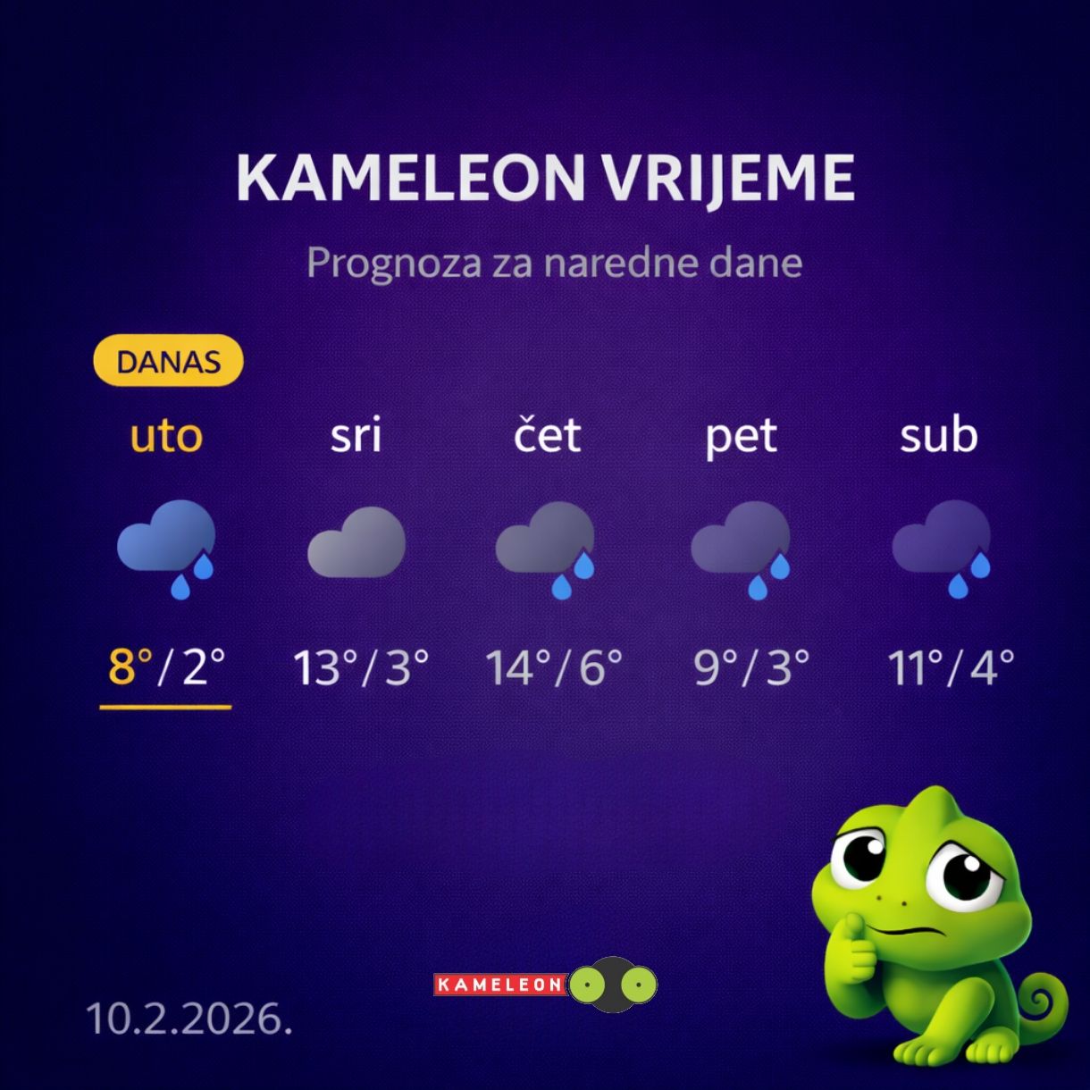 Tokom dana očekuje se pretežno oblačno vrijeme uz povremenu kišu. Na vrhovima planina padat će slab snijeg. Lokalno su mogući i jači pljuskovi, naročito u poslijepodnevnim satima u Hercegovini i na sjeveru Bosne.