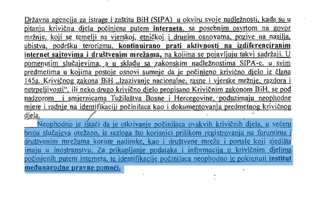 “Neophodno je istaći da je otkrivanje počinilaca ovakvih krivičnih djela, u većem broju slučajeva, otežano iz razloga što korisnici prilikom registrovanja na forumima i društvenim mrežama koriste nadimke, kao i društvene mreže i portale koji sjedišta imaju u inozemstvu. Za prikupljanje podataka i informacija o krivičnim djelima počinjenim putem interneta te identifikaciju počinilaca neophodno je pokrenuti institut međunarodne pravne pomoći”, stoji u odgovoru iz SIPA-e.