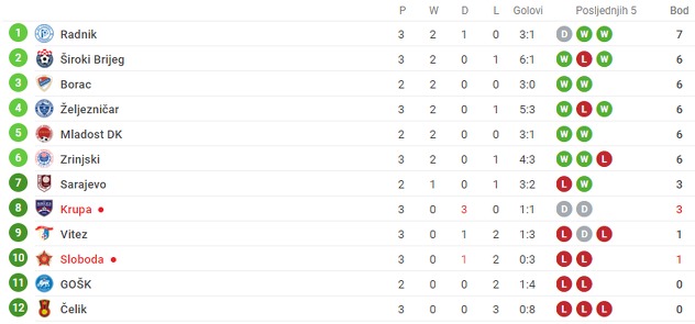 Krupa je s novim bodom ostala osmoplasirana ekipa Premijer lige, dok je Sloboda prestigla GOŠK i sada je na 10. mjestu.