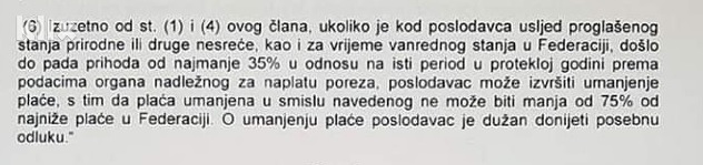 Nadalje se navodi da poslodavac može jednostranom odlukom radnicima izvršiti umanjenje plaće po osnovu broja radnih sati za koje je radno vrijeme skraćeno, s tim da se plaća može umanjiti najviše do iznosa od 35 posto od ugovorene plaće radnika i poslodavca.