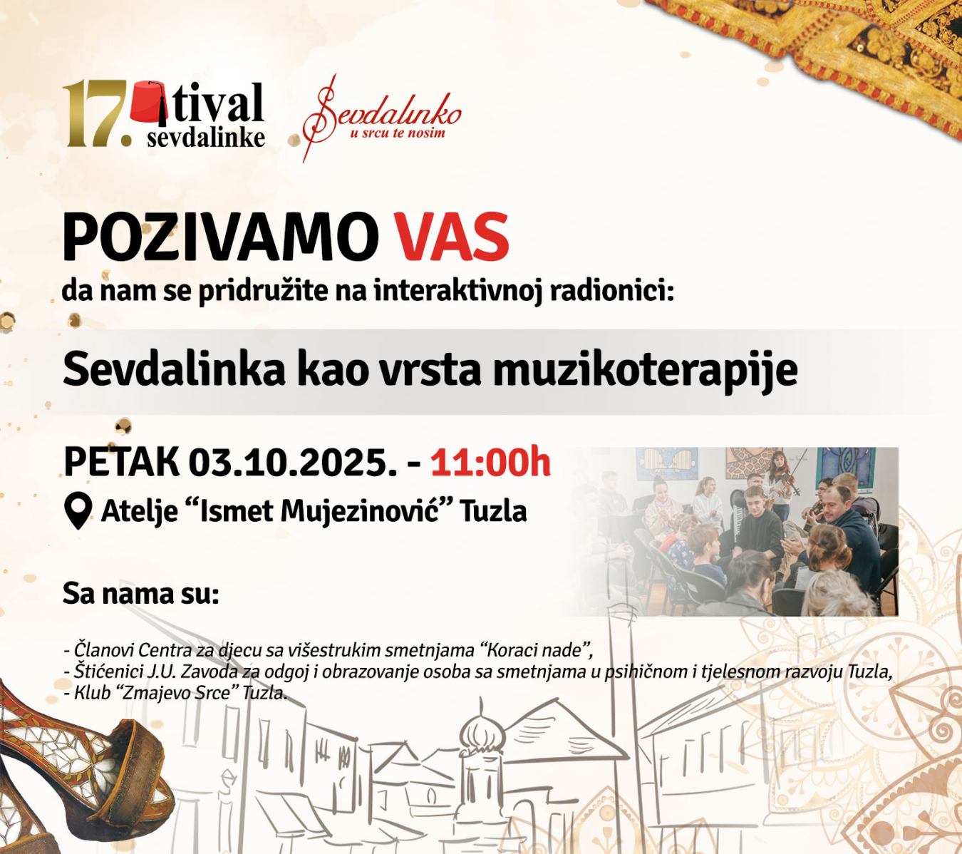 U Tuzli će u petak, 3. oktobra,biti održana radionica „Sevdalinka kao vrsta muzikoterapije“ u Ateljeu „Ismet Mujezinović“, s početkom u 11 sati.