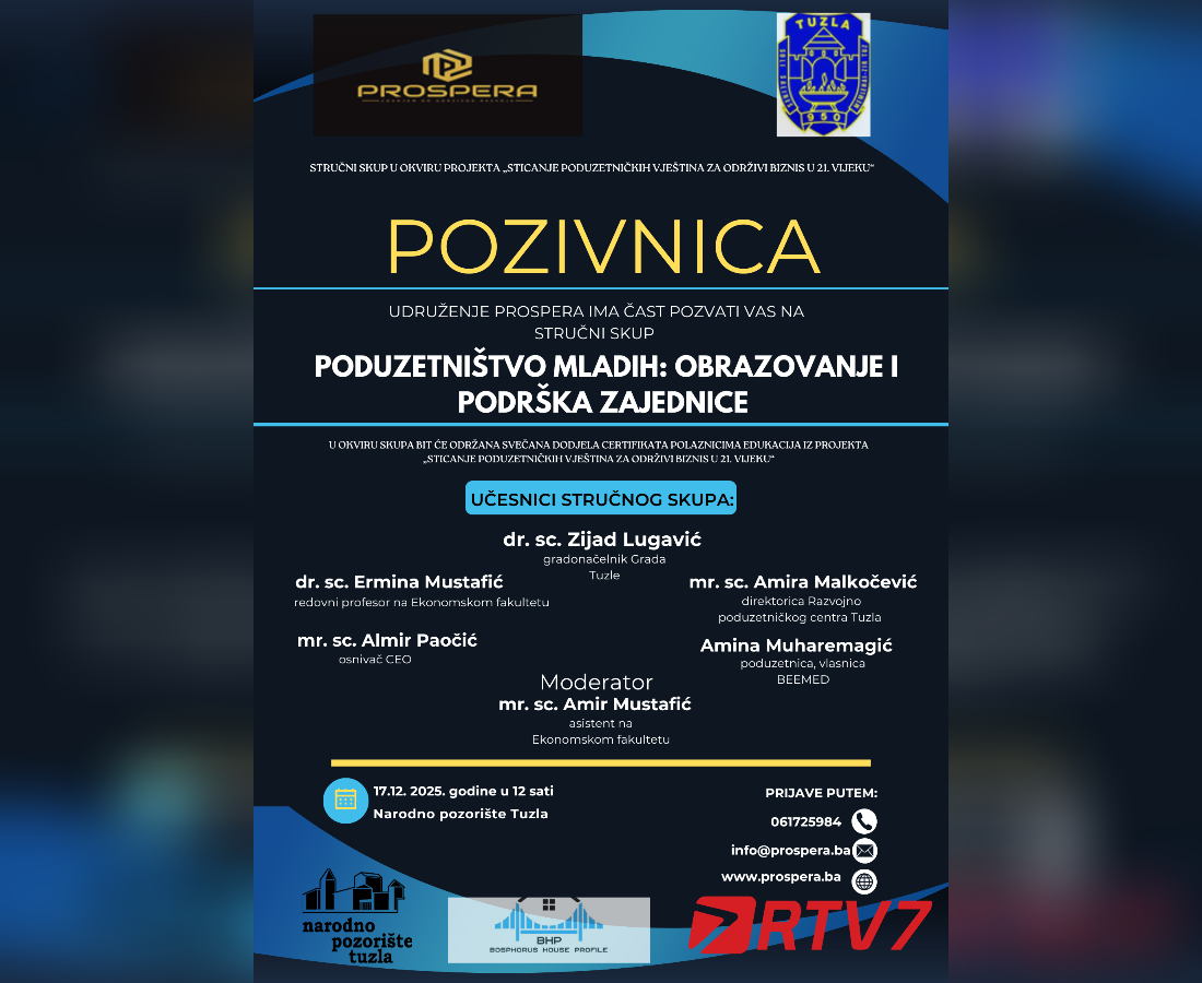 Udruženje PROSPERA organizuje stručni skup „Poduzetništvo mladih: obrazovanje i podrška zajednice“, koji će se održati 17. decembra 2025. godine, od 12:00 do 14:00 sati u Narodnom pozorištu Tuzla.