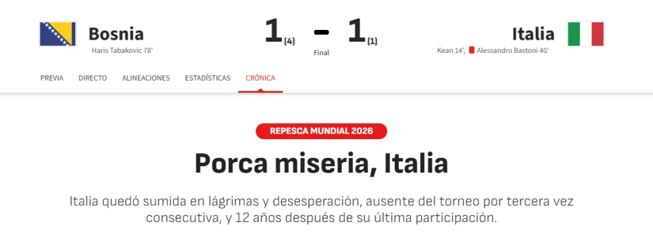 Posebno emotivne i oštre reakcije stigle su iz Španije. Marca je opisala utakmicu kao noć u kojoj je Bosna i Hercegovina izborila plasman nakon velikog preokreta, uz naglasak na atmosferu u Zenici i pritisak kojem su Italijani bili izloženi.