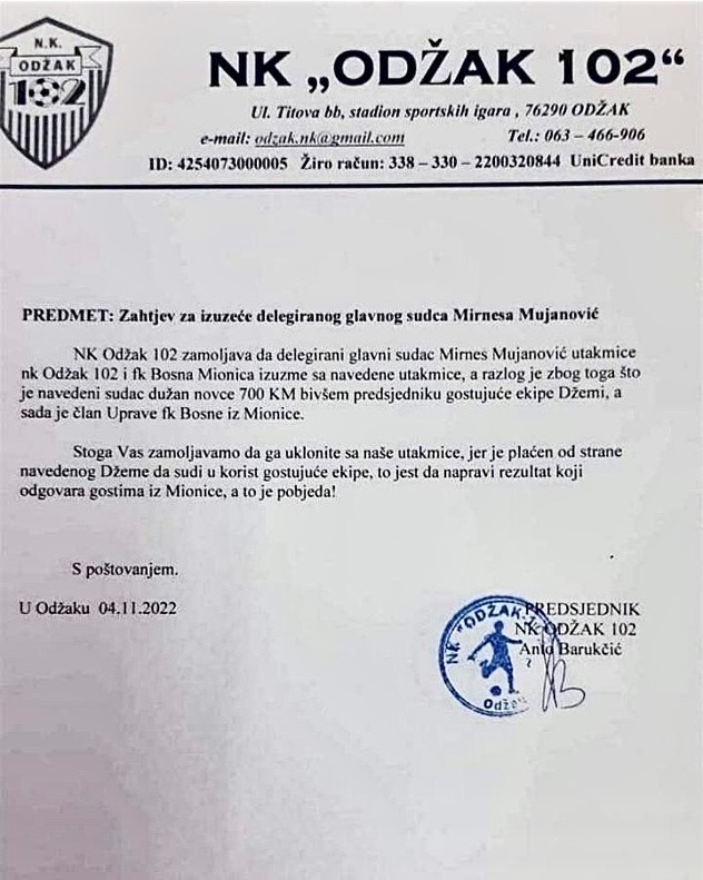 Kako su naveli iz Odžaka, navedeni sudija Mujanović je dužan 700 KM bivšem predsjedniku gostujuće ekipe Džemi, te upozoravaju da ga je Džemo platio da sudi u korist Bosne, odnosno da “napravi rezultat koji odgovara gostima iz Mionice, a to je pobjeda”.