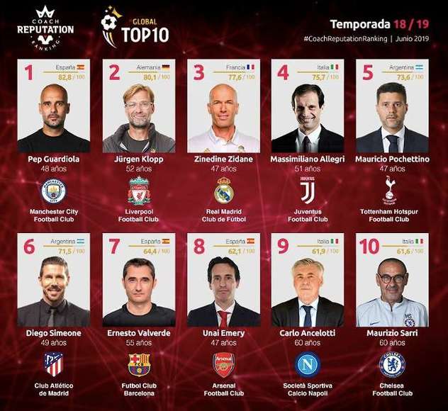 Coach Reputation Ranking je sastavio listu najboljih 10 trenera za sezonu 2018/19. Prošle godine, Zinedine Zidane je bio najbolji. Ali ove godine, menadžer Manchester Cityja Pep Guardiola je lider sa 82,8 bodova od mogućih 100.
