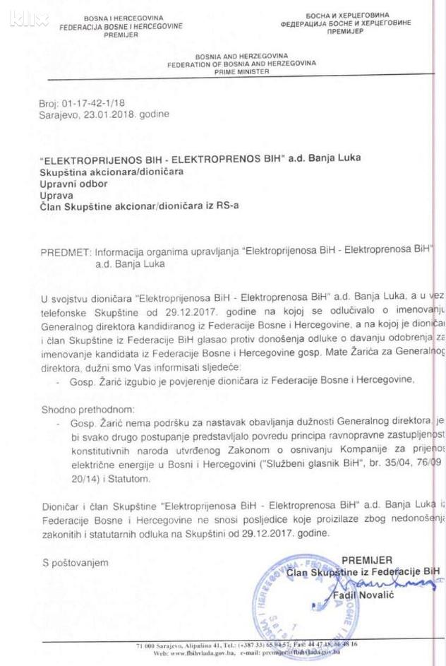 “Gospodin Žarić izgubio je povjerenje dioničara iz Federacije BiH. Shodno tome on nema podršku za nastavak obavljanja dužnosti generalnog direktora jer bi svako drugo postupanje predstavljalo povredu ravnopravne zastupljenosti konstituvnih naroda utvrđenu Zakonom o osnivanju Kompanije za prijenos električne energije u BiH”, napisao je Novalić.