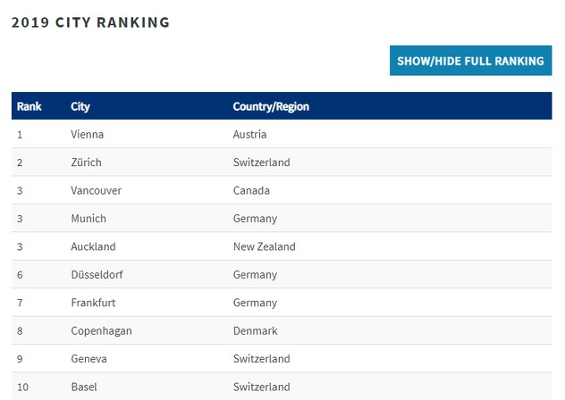 Drugo mjesto pripalo je švicarskom Cirihu, a treće kandaskom Vancouveru. Slijede Mihen, Auckland, Dizeldorf, Frankfurt, Kopenhagen, Ženeva i Basel.