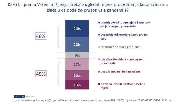 Ostatak stanovništva je mišljenja da mjere trebaju biti blaže nego u prvom valu (17 posto) ili da trebaju biti minimalne (15 posto). Zanimljivo je da skoro 13 posto populacije smatra da ne treba uvoditi nikakve posebne mjere u slučaju novog vala koronavirusa.