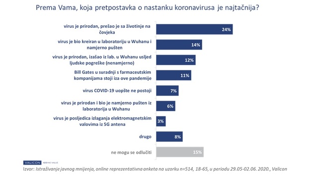 Prema dobijenim rezultatima, gotovo četvrtina građana ili 24% vjeruje u službenu, naučno utemeljenu teoriju odnosno da je koronavirus prirodan virus te da je prešao sa životinje na čovjeka i počeo se širiti kao i ostali virusi.