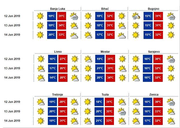 Na sjeveru i sjeveroistoku Bosne je moguće je jače grmljavinsko nevrijeme, praćeno jakim udarima vjetra i gradom. Jutarnje temperature kretat će se od 13 do 19, na jugu od 18 do 24, a dnevne od 30 do 36 stepeni.