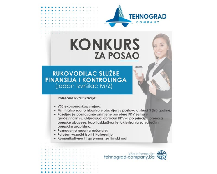 Kompanija Tehnograd Company d.o.o. objavila je konkurs za prijem radnika u radni odnos na poziciju rukovodioca službe finansija i kontrolinga.